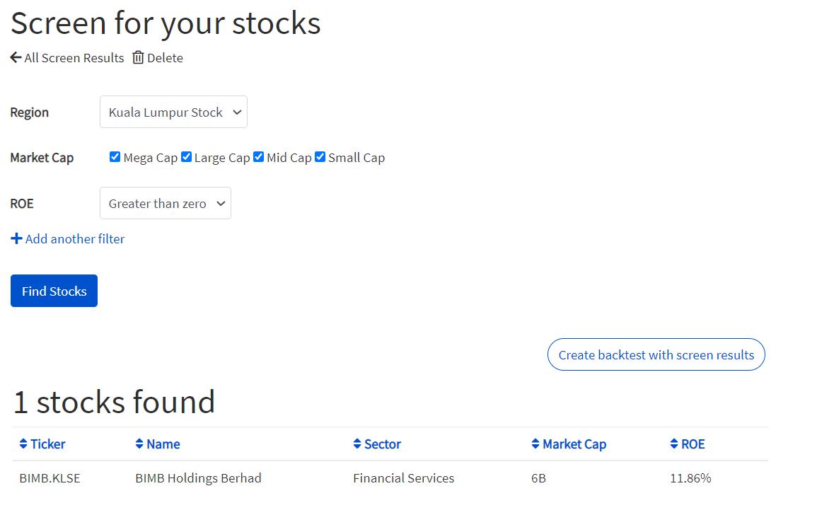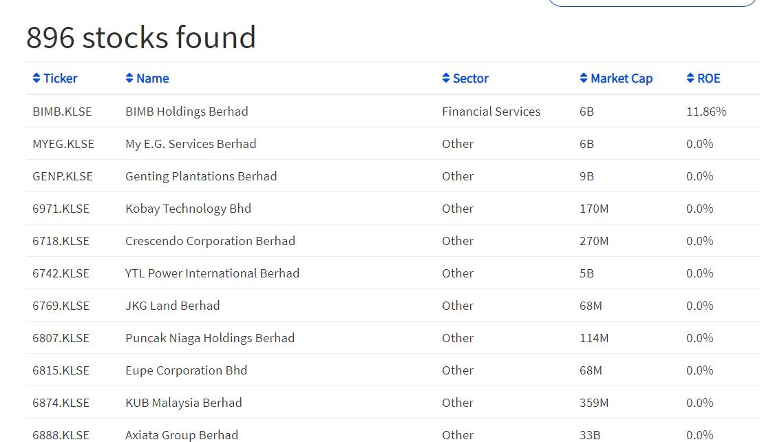 When screening with KL stocks with filter 'ROE greater than zero', the screener only returns 1 stock.
